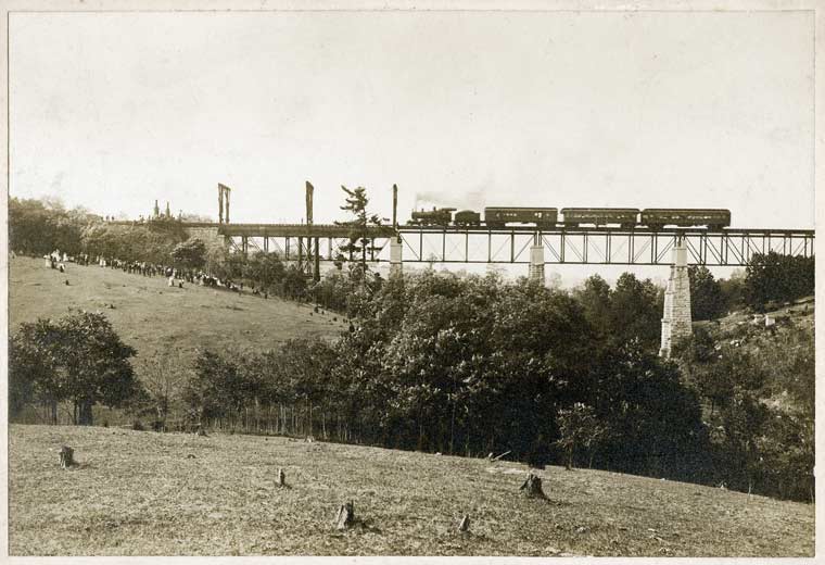 A hand written note on the back of the photograph identifies this as the bridge-span over the Rivanna River at the foot of Monticello (.42 miles east of the Mill, .47 miles north of the House). It's a safe assumption that this was a gathering celebrating the official opening of the span, there are over 100 people in attendance, men women and children. The Central Virginia rail line came to Charlottesville in 1850, but the photographic technology plus the presence of what look to be masonry piers from a previous structure argue for a later date for this photo, c. 1905. Please contact us if you can provide an exact date.--emory@historicwoolenmills.org